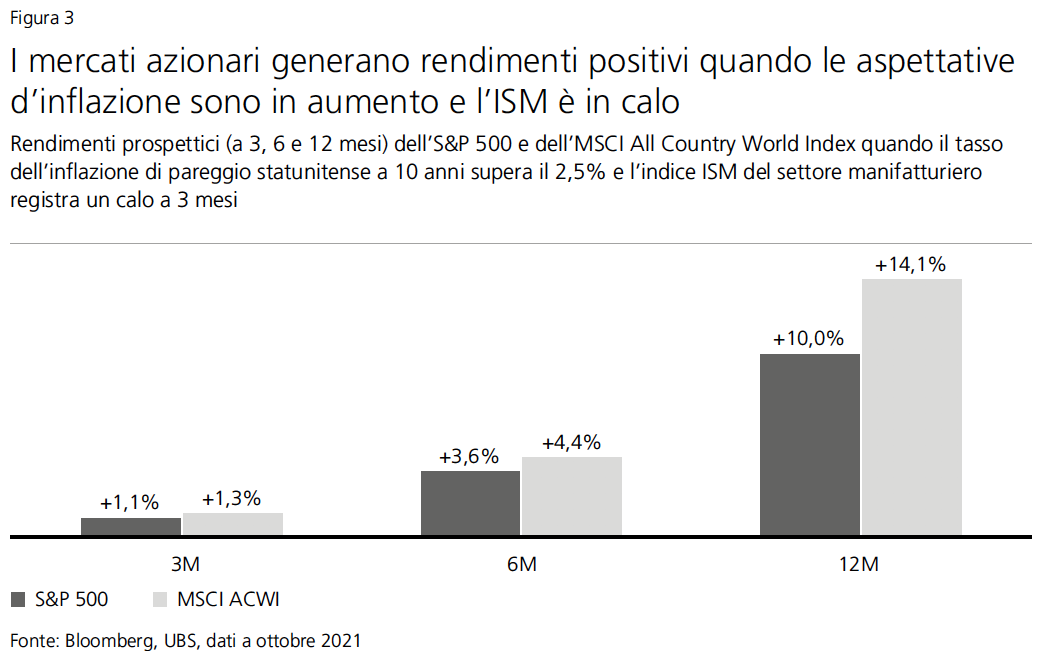 In base a tutti questi fattori, prevediamo una crescita degli utili per azione (EPS) dell’S&P 500 del 45% nel 2021 e del 10% nel 2022. Su scala globale l’EPS dovrebbe registrare incrementi del 43% quest’anno e del 9% il prossimo. Alla luce delle attuali valutazioni, alcuni investitori temono che i mercati azionari risentano del picco della crescita economica a fronte dell’aumento delle aspettative d’inflazione. Ma in base ai precedenti storici questi timori ci sembrano eccessivi. Nei due periodi dal 1998 ad oggi in cui il tasso d’inflazione di pareggio statunitense a 10 anni si attestava sopra il 2,5% e l’indice ISM del settore manifatturiero era in calo (2004-05 e 2011), i mercati azionari hanno prodotto rendimenti positivi a 3, 6 e 12 mesi.