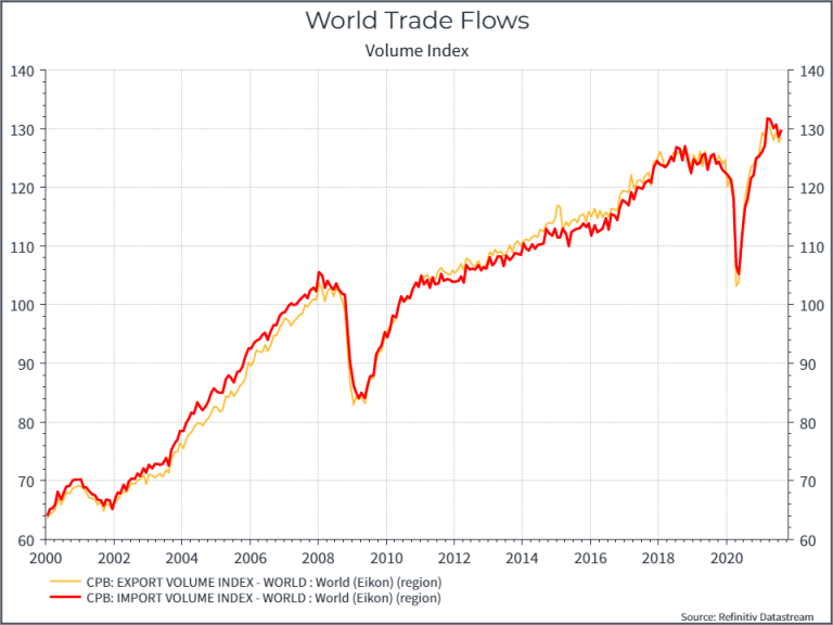 Il grafico seguente mostra l’evoluzione dei volumi degli scambi globali, ancora una volta un aumento costante interrotto da un paio di grandi cali. I volumi commerciali attuali sono già tornati più o meno al livello di tendenza pre-pandemia, riflettendo la ripresa domanda di beni in tutto il mondo.