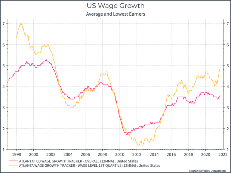 Tornando al consumatore statunitense, il grafico qui sotto mostra la crescita dei salari (per il lavoratore medio e per il 10% dei lavoratori con lo stipendio più basso). Ciò che si nota è un una crescita salariale costante (sebbene ora con un’inflazione più elevata) per la media e una crescita relativamente maggiore per i meno pagati.