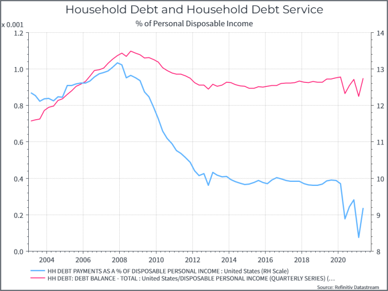 Infine, un paio di grafici sullo stato delle famiglie americane. Il primo mostra il debito delle famiglie e il costo del servizio del debito rispetto al reddito disponibile. Il debito delle famiglie non è realmente aumentato durante la pandemia, mentre il costo del servizio del debito (interessi passivi) è diminuito, grazie ai tassi di interesse più bassi. Ci sono ancora molte famiglie in difficoltà negli Stati Uniti, ma il quadro complessivo sembra abbastanza solido.