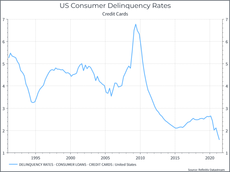 Allo stesso modo, il grafico seguente mostra la percentuale di insolvenze sulle carte di credito al consumo. Ancora una volta, suggerisce, nel complesso, che le famiglie statunitensi stanno gestendo le loro finanze e hanno soldi da spendere.