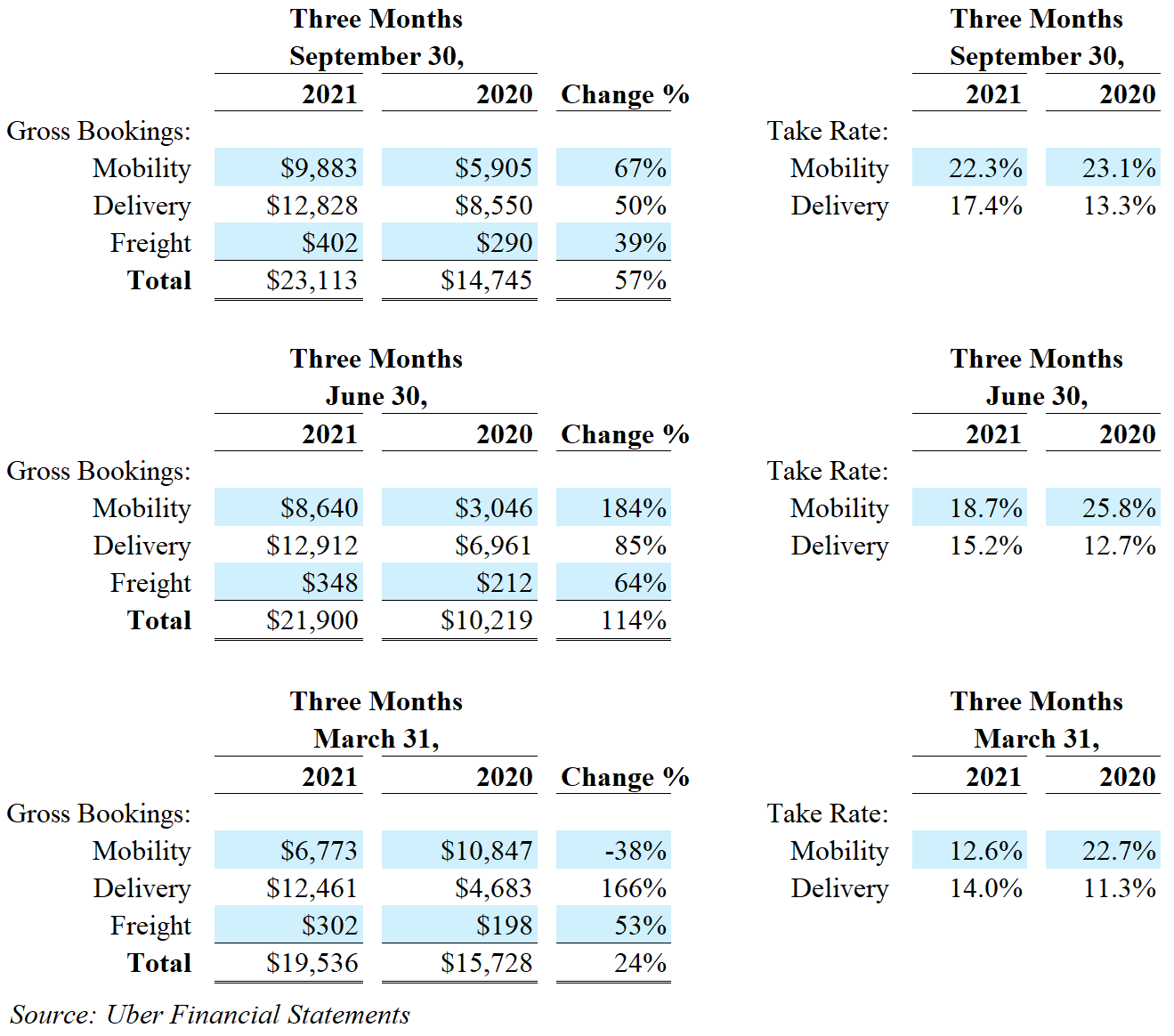 Negli ultimi due trimestri risulta evidente l’aumento netto delle prenotazioni in tutti i settori. Se confrontiamo i dati con i take rates, si può concludere che il settore del ride sharing sta perdendo colpi – indicazione sicura di una concorrenza sempre più agguerrita – mentre il ramo delivery suggerisce l’idea che le recenti acquisizioni stiano portando i loro benefici.