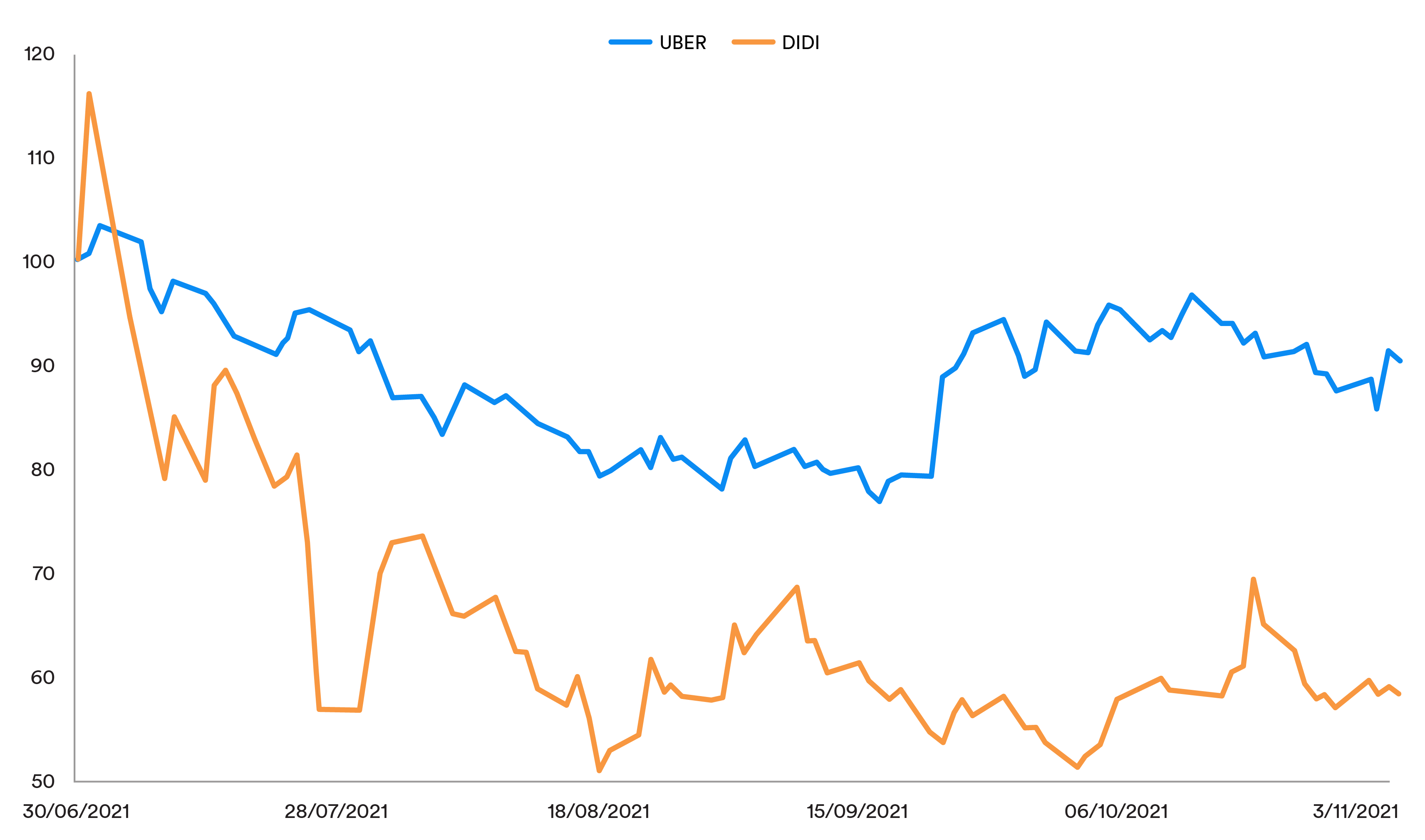 Da quando DiDi è stata quotata in borsa, i titoli delle due società hanno evidenziato una certa tendenza comune, con i prezzi in leggero recupero solo dalla seconda metà di ottobre.