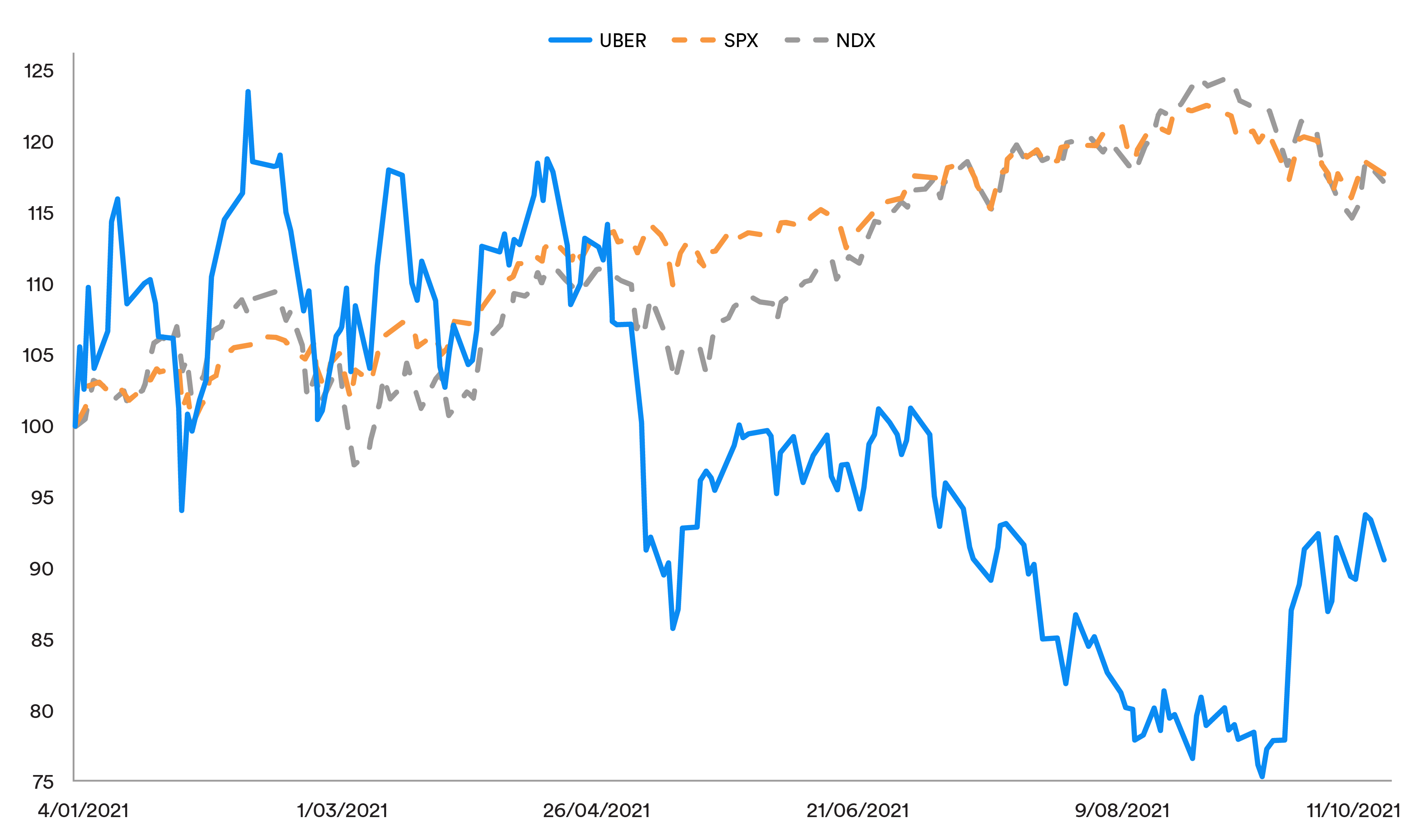 Dopo aver iniziato il primo trimestre 2021 con frequenti sovra-performance, rispetto ai benchmark S&P 500 (SPX) e Nasdaq-100 (NDX), oggi il rendimento da inizio anno del titolo Uber mostra un considerevole ritardo.