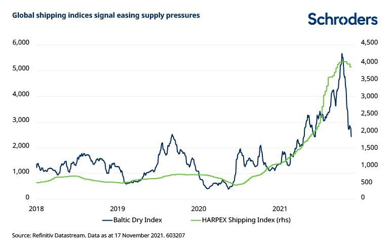 La storia dimostra che i ritardi nelle catene di approvvigionamento tendono ad aggiustarsi abbastanza rapidamente dopo intensi periodi di stress, poiché il mercato risponde a una domanda più alta e ricomincia ad accantonare scorte. Non vediamo alcuna ragione per cui non debba accadere anche questa volta, nel corso del 2022. In effetti le tariffe di spedizione delle merci hanno già iniziato a scendere.