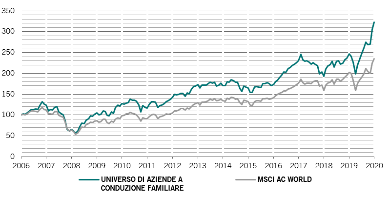 Fonte: Pictet Asset Management, 2021. Abbiamo simulato la performance in USD dell’universo dei titoli a conduzione familiare dal 31 dicembre 2006 al 31 dicembre 2020. La performance risultante dal backtest NON è un indicatore dei risultati effettivi futuri. I risultati riflettono la performance di una strategia non offerta in passato agli investitori e NON rappresentano rendimenti effettivamente conseguiti da un investitore. I risultati dei backtest sono calcolati mediante l’applicazione retroattiva di un modello costruito sulla base di dati storici e basato su presupposti integrali al modello che possono essere o meno verificabili e sono soggetti a perdite.