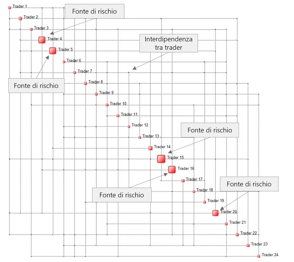 Per fare questo tutto ciò che è necessario sono informazioni in tempo reale su profitti e perdite (PnL) di ciascun trader. QCM assembla quindi una mappa di complessità del trading desk. Di seguito è riportato un piccolo esempio. I trader sono allineati lungo la diagonale mentre i punti che collegano i vari segmenti verticali e orizzontali rappresentano le interdipendenze tra i trader, quindi tra le negoziazioni. Al fine di ridurre al minimo il rischio, gli operatori cercano di evitare interdipendenze tra i trader, più o meno come in un portafoglio diversificato. Più densa è la mappa, maggiore è la complessità, maggiore è il rischio. Questo perché una mappa densa significa che il danno può propagarsi più velocemente.