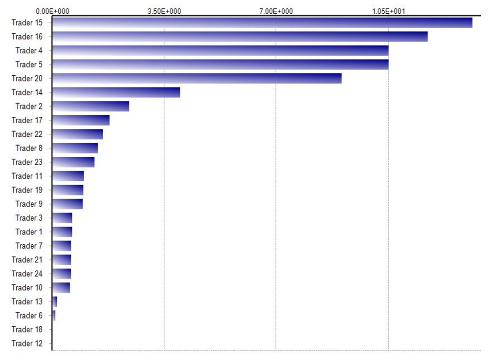 Viene rilevata una complessità in rapida crescita, la profilazione della complessità del desk fornisce una ripartizione del rischio complessivo, indicando quali trader concentrano il rischio. In questo semplice caso si tratta di trader 15, 16 4, 5 e 20. Di seguito è illustrato un profilo di complessità del trading desk il giorno della perdita massima.