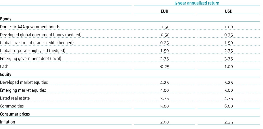 Previsioni di Expected Returns 2022-2026 sulla probabile performance delle principali classi di attivi nei prossimi cinque anni. Fonte: Robeco.