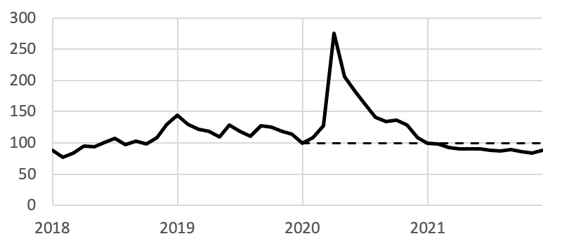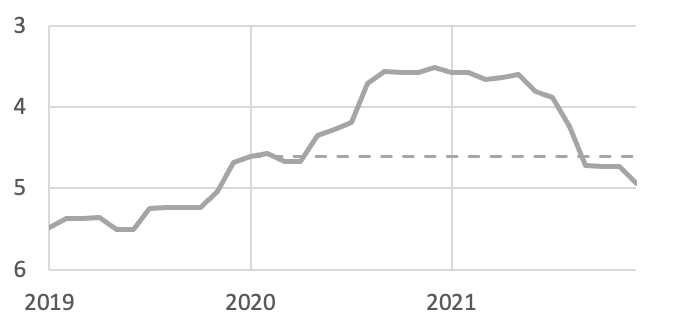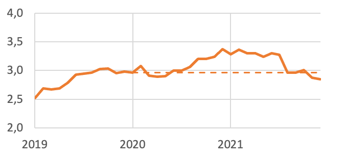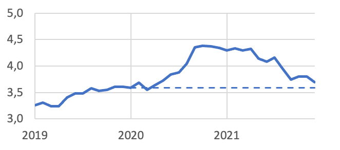Ancora maggiore è stata la diminuzione del grado di indebitamento netto nello stesso periodo. Nel caso di questo indicatore, al debito di un’impresa viene sottratta la liquidità e il risultato viene quindi messo in proporzione con l’utile prima di interessi, imposte e deprezzamento. All’inizio del 2020, il grado di indebitamento netto era a 3,0x, salendo a 3,4x nell’ambito della pandemia; da allora è sceso a 2,8x, ovvero al di sotto del livello precedente la crisi. La forte flessione è dovuta al netto aumento degli utili delle imprese, che sono stati distribuiti solo in parte agli azionisti e rimangono quindi in bilancio come liquidità.