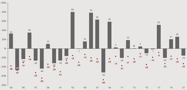 Ribassi in valuta locale medi durante l’anno del 29,7% (mediana di -23,8%) e rendimenti annuali positivi 15 anni su 28