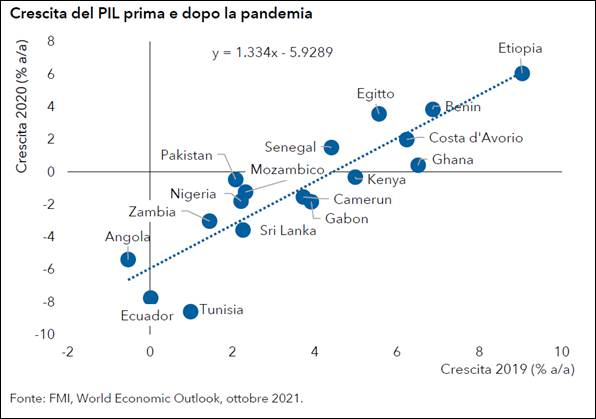 La pandemia ha gravemente interrotto il percorso di crescita di molte economie, anche di quelle dei mercati di frontiera, ma i Paesi a più elevata crescita ne hanno risentito meno. Il seguente grafico evidenzia come nel 2020 il rallentamento della crescita nei mercati di frontiera sia dipeso linearmente dal tasso di crescita registrato in tali Paesi nel 2019. La pendenza (1,25) della linea di regressione lineare indica che per ogni punto percentuale aggiuntivo di crescita che un Paese ha registrato nel 2019, la successiva recessione nel 2020 è stata meno profonda di 1,25 punti percentuali.