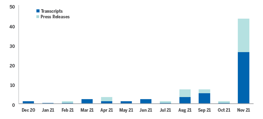 Le società quotate hanno da poco iniziato a discutere del metaverso: le menzioni del metaverso nei bandi pubblici e nei comunicati stampa di novembre superano la somma delle menzioni dell’intero anno precedente. Non se ne parla solo nelle aziende del settore tech (che vede un 48% di citazioni), ma anche in quelle nei settori dei servizi ai consumatori (17%), delle telecomunicazioni (7%), dei consumi ciclici (5%) e dei servizi per le imprese (5%). Le società che ne discutono sono varie, dalle produttrici di microchip come Nvidia e Qualcomm a società di software come Microsoft, ma anche le aziende di gaming come Roblox e di consumo come Ralph Lauren e Disney.