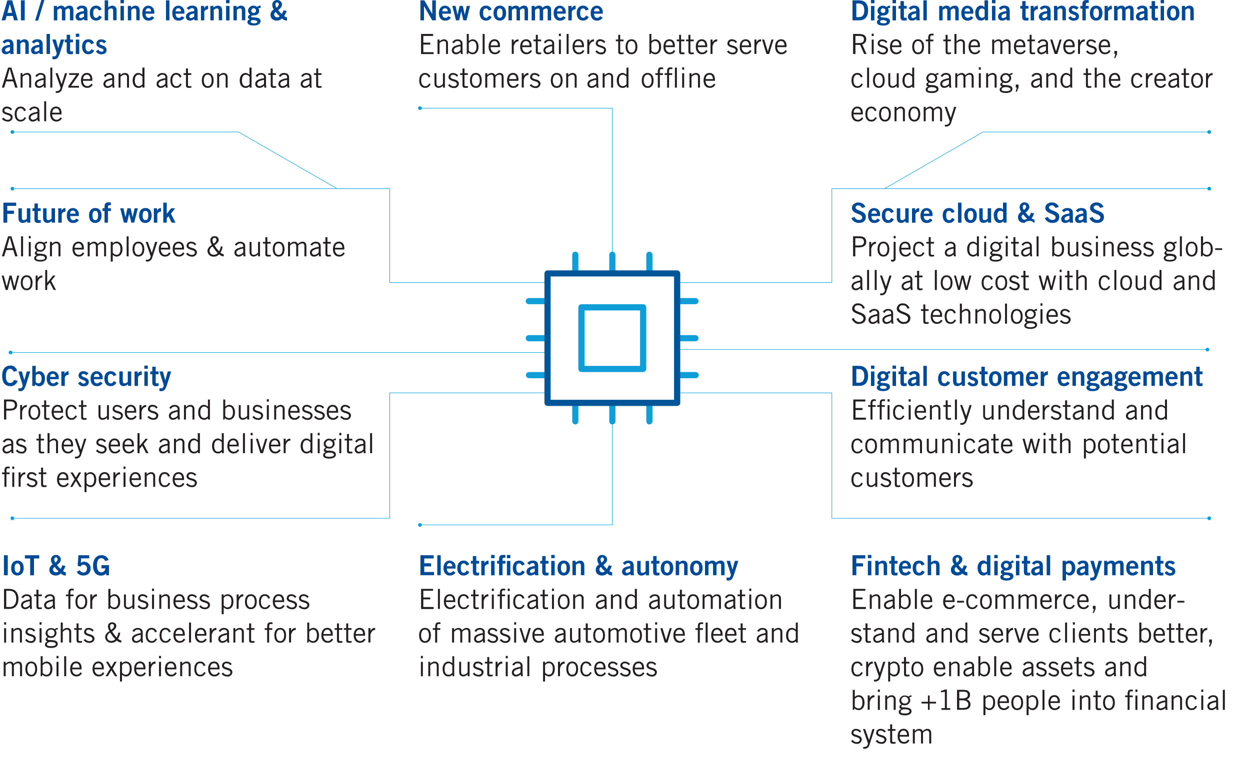 A parte le valutazioni, tra i rischi sui quali stiamo vigilando vi sono la pandemia, la regolamentazione, le limitazioni delle catene di approvvigionamento (particolarmente i semiconduttori, la produzione elettronica e la logistica) e le implicazioni di una crisi crescente del talento nei settori IT e dei servizi di comunicazione. In particolare, stiamo seguendo con estrema attenzione le indagini sulle pratiche commerciali adottate negli Stati Uniti e nell’Unione Europea dai principali leader digitali, fra cui Alphabet, Amazon, Facebook (che ora sono chiamati le Meta Piattaforme) e Apple. Infine, la capacità di occupazione nel settore tecnico e delle vendite di tecnologia si sta restringendo; con la crescente difficoltà nel trovare personale di talento, potrebbero aumentare le società che adottano strumenti per la produttività low-code e software engineer, una crescita trainata dai prodotti e tecniche di vendita digitale in gran parte già ampiamente adottate durante il COVID-19.