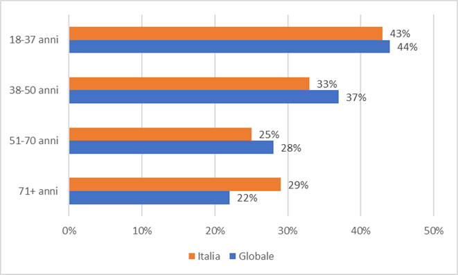 Il 40% dei rispondenti italiani over 71 (identica la percentuale globale), invece, si sentirebbe probabilmente più incline a spendere, piuttosto che risparmiare in questo scenario.