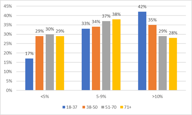 Grafico 2. ROI annuo atteso dagli intervistati sui rispettivi portafogli nei prossimi cinque anni considerando reddito e crescita del capitale. Le vecchie generazioni si attendono rendimenti più modesti, dato che di norma con l’avanzare dell’età si rivede il profilo di rischio