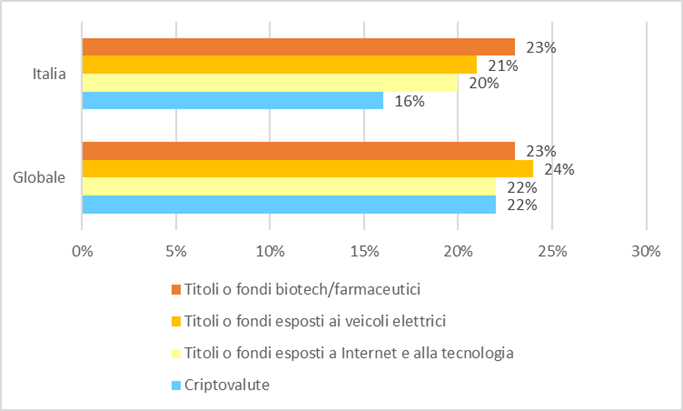 Nel dettaglio, a formare il podio delle tre tipologie di nuovi investimenti effettuati per la prima volta nell’ultimo anno dagli investitori italiani sono settori nuovi ed emergenti. I titoli azionari biotech e farmaceutici conquistano il primo posto (23%), il secondo va ai fondi esposti ai veicoli elettrici (21%), il terzo ai nomi di internet e tecnologici (20%), mentre seguono in coda le criptovalute (16%).