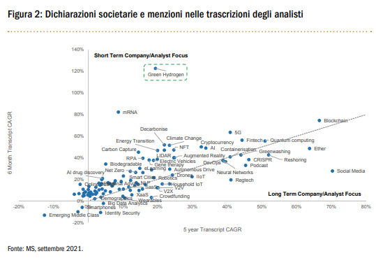 Benché la discussione sull’idrogeno verde abbia continuato a crescere stabilmente, negli ultimi 6 e 12 mesi ha raggiunto livelli smisurati (Figura 2), superando di netta misura tutti gli altri temi, compreso il 5G, la Blockchain e l’IA. Come si spiega questa crescita esponenziale dell’interesse?
