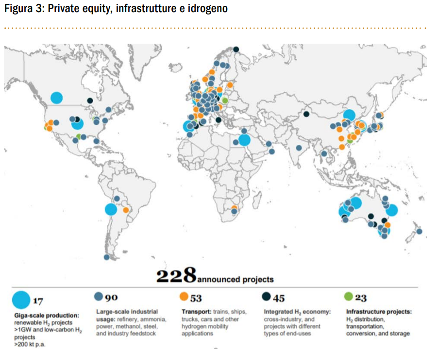 Nell’ultimo anno, il governo cinese ha stanziato USD 20 miliardi di finanziamenti pubblici in progetti sull’idrogeno. Finora, il 50% dei progetti annunciati è legato ai trasporti, un settore chiave del piano di transizione energetica nazionale. Al contempo, gli Stati Uniti hanno riadottato l’obiettivo della neutralità carbonica rientrando nell’Accordo di Parigi subito dopo l’insediamento del presidente Biden. Lo scorso agosto il governo britannico ha detto di voler sviluppare un florido settore del carbonio verde per superare i problemi di decarbonizzazione dell’economia nazionale, annunciando la UK Hydrogen Strategy. L’ambizione di questo piano nazionale è costruire 5 GW di capacità di produzione di idrogeno a bassa intensità di carbonio entro il 2030. Una simile capacità è in grado di produrre una quantità di idrogeno pari al gas consumato da più di tre milioni di famiglie nel Regno Unito ogni anno. La UK Hydrogen Strategy è un piano a 360° che adotta un metodo olistico per creare un settore dell’idrogeno prospero. La strategia stabilisce cosa deve accadere per abilitare la produzione, distribuzione, conservazione e l’utilizzo dell’idrogeno e garantire opportunità economiche in tutto il Regno Unito. Cominciamo a vedere l’ingresso sulla scena di imprese specializzate nella produzione, nella distribuzione e nell’utilizzo dell’idrogeno. In tutto il mondo, sono in corso 228 progetti sull’idrogeno lungo l’intera catena del valore (Figura 3), 17 dei quali sono piani di produzione su grandissima scala.
