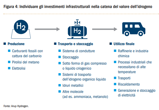 Di recente sono state effettuate due acquisizioni importanti: quella del produttore canadese di elettrolizzatori Hydrogenics per USD 290 milioni da parte dell’azienda energetica Cummins, e la quota di maggioranza rilevata da MAN Energy Solutions nel produttore tedesco di elettrolizzatori H-TEC Systems per una cifra non divulgata. Inoltre, stiamo cominciando a veder confluire investimenti più rischiosi nelle startup in fase iniziale dedite alla produzione di idrogeno non da elettrolisi. Il finanziamento dello sviluppo di progetti di questo tipo e dei servizi di integrazione potrebbe segnalare la maturazione del settore L’Hydrogen Council stima che gli investimenti totali nella filiera dell’idrogeno potrebbero superare la cifra di USD 300 miliardi entro il 2030 e, stando alla Energy Transitions Commission, raggiungere circa USD 15.000 miliardi entro il 2050. Ciò dimostra tanto l’esigenza quanto l’opportunità di far confluire investimenti privati nella catena del valore (Figura 4).