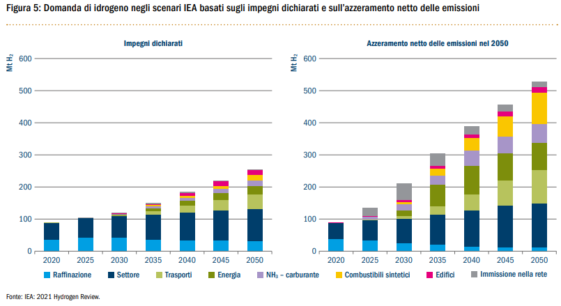 Delle varie barriere che si frappongono a un’adozione su vasta scala dell’idrogeno – dai costi all’efficienza – due ci sembrano particolarmente rilevanti. Il primo è l’attuale limitatezza della domanda. Sebbene sul versante della produzione il sostegno politico-legislativo stia aumentando, la tecnologia stia progredendo e i costi stiano diminuendo, la domanda effettiva di questa molecola è ancora limitata. Gli impegni di azzeramento netto potrebbero tuttavia rilanciarla (Figura 5). L’ulteriore sviluppo delle infrastrutture sarà cruciale nel decidere se l’idrogeno verde sarà la panacea della decarbonizzazione.
