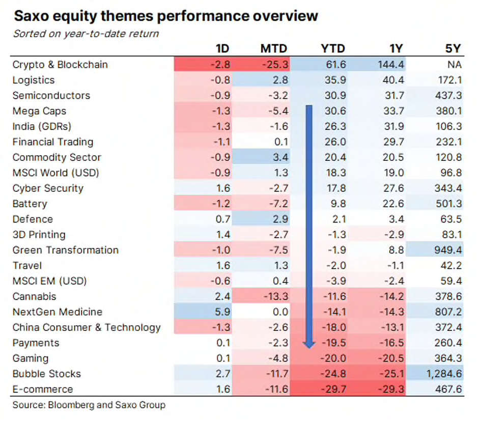 Come mostra la tabella delle performance, quest’anno è stato caratterizzato da notevoli differenze all’interno del mercato azionario. In basso tematici come gaming, bubble stock e e-commerce che sono scesi rispettivamente del 20%, 25% e 30% poiché colpiti da aspettative di ricavi inferiori e dai tassi d’interesse più alti quest’anno, con la debolezza che probabilmente continuerà l’anno prossimo quando i tassi d’interesse a lungo termine saranno costretti a chiudere parte del gap con l’inflazione. I tre temi più performanti di quest’anno sono stati: Crypto & Blockchain (+62%), Logistica (+36%) e Semiconduttori (+31%), indicativi dell’anno che abbiamo passato. Le criptovalute hanno prosperato grazie all’afflusso di nuovo denaro e all’adozione istituzionale su una scala senza precedenti negli ultimi cinque anni. I titoli della logistica e dei semiconduttori si sono avvantaggiati grazie al potere dei prezzi in mezzo a una domanda straordinaria e a complessi vincoli di fornitura che espandono le entrate e i profitti operativi di queste aziende. Gli indicatori recenti non suggeriscono che le cose miglioreranno drasticamente nel primo trimestre e quindi ci si aspetta che questi due temi mantengano lo slancio.
