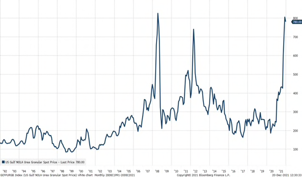 La crisi energetica incentrata sulle forniture di gas naturale si è evoluta in una crisi di produzione di fertilizzanti con un’impennata dei prezzi (vedi grafico) che avrà un impatto sui prezzi degli alimenti il prossimo anno. Quest’anno lanceremo un paniere alimentare che consisterà in agricoltura verticale, allevatori, produttori di semi, produttori e distributori di zucchero e caffè, attrezzature agricole. Questo paniere avrà alcune sovrapposizioni con il paniere delle materie prime, ma sarà molto più ristretto.