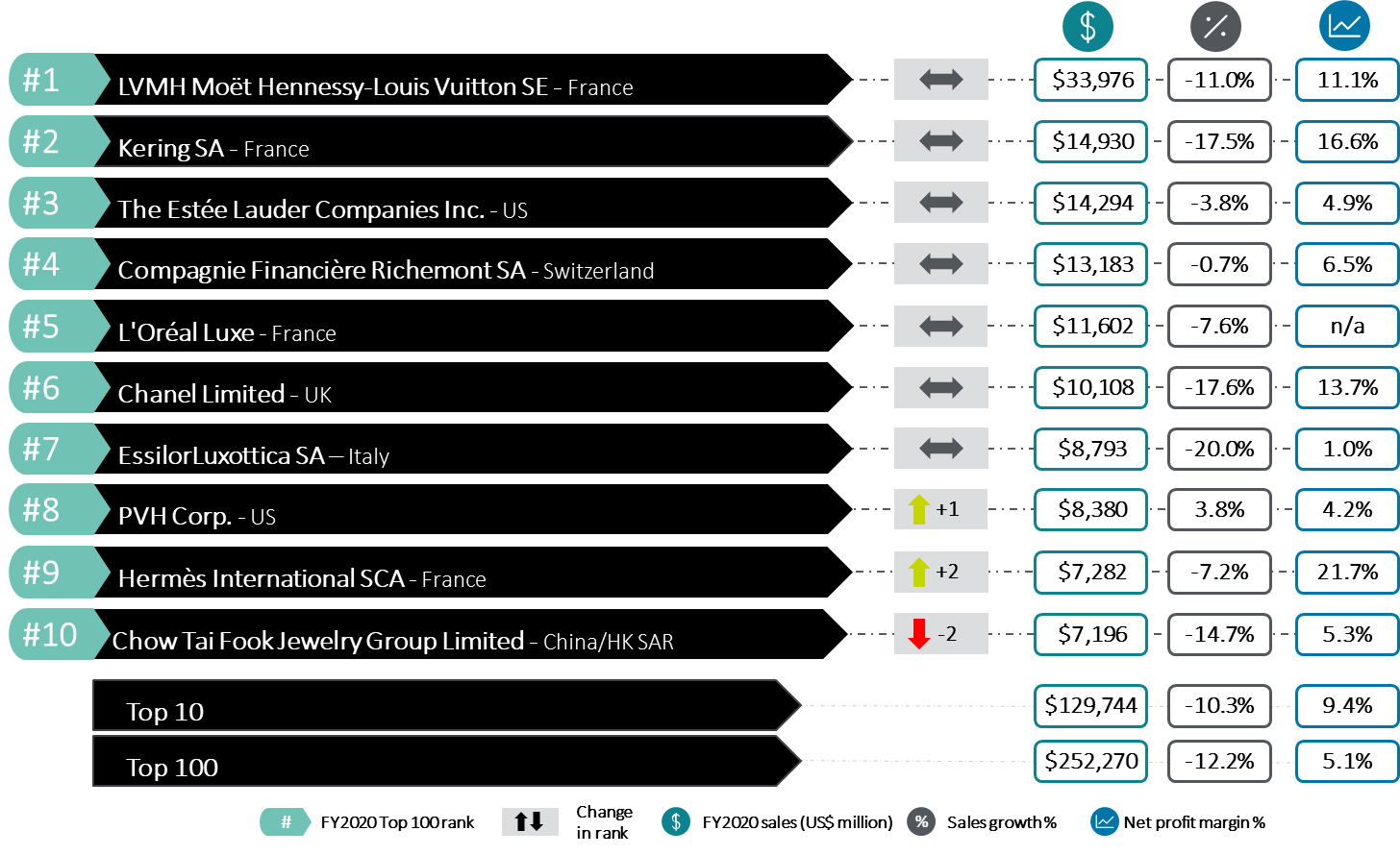 La top ten dei big del lusso è pressoché stabile rispetto al FY2019, con un principale cambiamento: Hermès entra per la prima volta nella top ten al nono posto, registrando anche la migliore performance in termini di net profit: 21.7%. Per il quarto anno consecutivo, il quartetto dei migliori player del lusso è composto dai colossi LVMH Moët Hennessy Louis Vuitton SE, Kering SA, The Estée Lauder Companies Inc. e Compagnie Financière Richemont SA. Il gruppo L’Oréal Luxe e Chanel rimangono stabili rispettivamente al quinto e sesto posto, così come EssilorLuxottica SA al settimo posto.