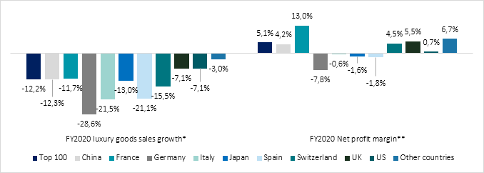 In un anno particolarmente complesso per l’intero settore, l’importanza dei grandi conglomerati del lusso si dimostra determinante ai fini di raggiungere buoni risultati finanziari. Testimonianza ne è la Francia che con solo otto aziende in classifica, di cui quattro in top 10, è il paese che ha conseguito performance migliori: a discapito di una decrescita delle vendite dell’11,7%, l’utile netto è stato non solo positivo ma addirittura a doppia cifra: 13%, il più alto tra i paesi. Anche il CAGR per il periodo FY2017-2020 è stato il migliore al 5.9%.