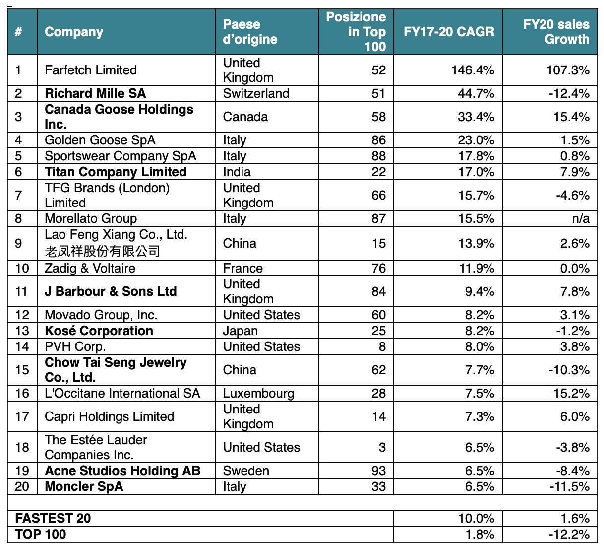NB. Le aziende in grassetto rientravano tra le fastest growing companies già nel report Global Powers of Luxury Goods 2020