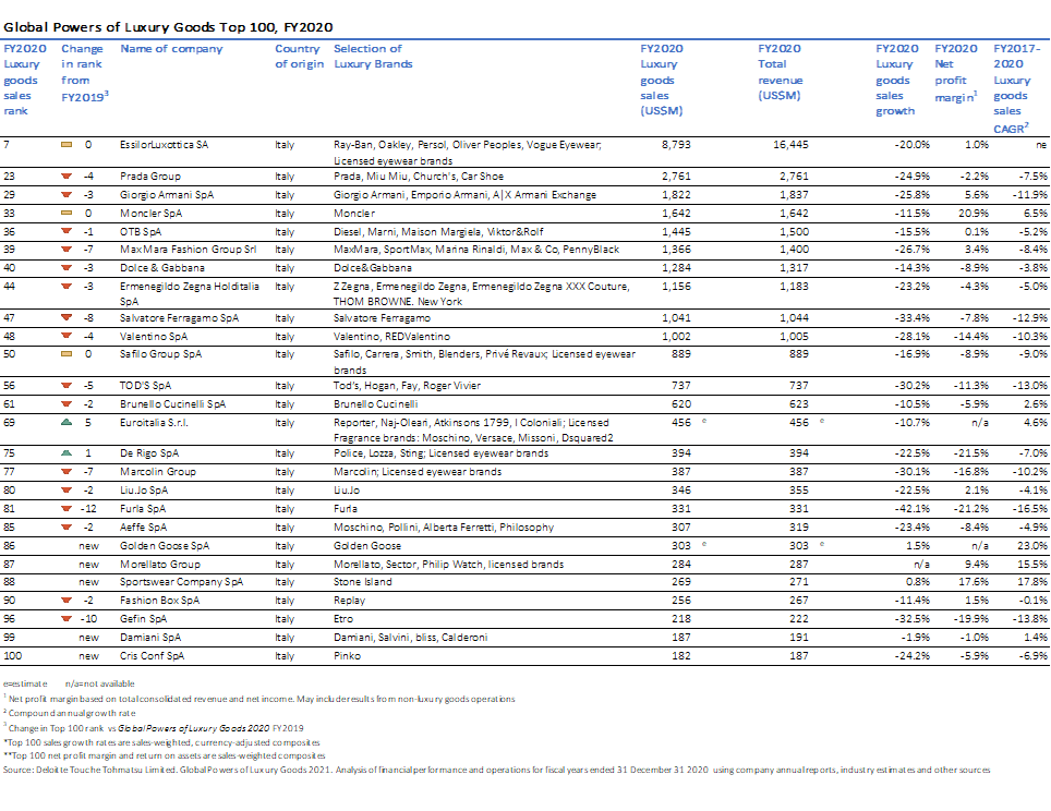 Ancora più che negli anni precedenti, l’Italia con il suo Made in Italy si conferma Paese leader nel settore, posizionando ben 26 aziende tra le 100 che costituiscono la graduatoria[2]. I nuovi ingressi di questa edizione vedono protagonisti Golden Goose (86°), Morellato (87°), Sportswear Company (Stone Island) (88°), CrisConf (Pinko) (100°) sono i quattro nuovi ingressi italiani tra i big del lusso mondiale. Rientra in classifica anche Damiani al 99° posto.