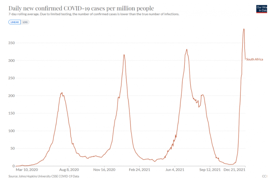 Infine, per chi si sente ottimista, si potrebbe guardare al numero di casi confermati in Sud Africa, uno dei primi Paesi a identificare la variante Omicron. I primi dati ci dicono che il numero di casi confermati per milione di persone, pur partendo da un livello molto elevato, ha iniziato a diminuire.