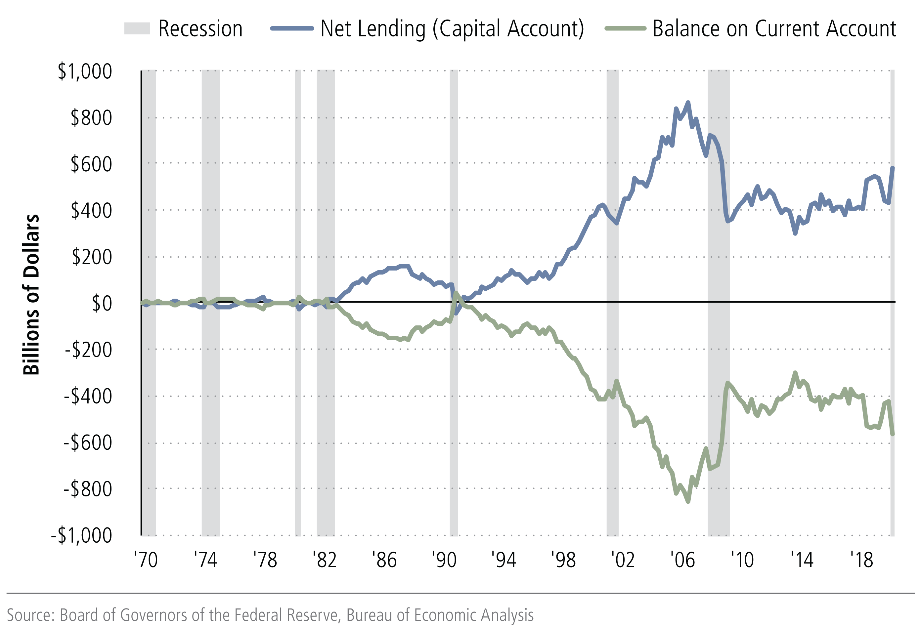 Gli Stati Uniti, nel loro complesso, risparmiano troppo poco e spendono troppo. Questo “deficit” deve pur essere finanziato in qualche modo. Per funzionare, il sistema si basa sul fatto che i Paesi esteri finanzino le importazioni degli USA. Gli scettici del dollaro amano tracciare teatralmente il grafico dello squilibrio delle partite correnti del Paese e prevedere un forte calo del valore della moneta.