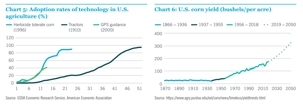 È un buon momento per investire nell’agricoltura anche per gli attesi imminenti aumenti di produzione, dovuti alle nuove tecnologie e per gli effetti positivi che la produttività avrà sui rendimenti dei terreni agricoli. Nel corso dell’ultimo secolo, l’introduzione di nuove tecnologie agricole e la loro diffusione hanno avuto un crescente impatto sul Total Factor Productivity (TFP), che misura i cambiamenti nell’efficienza con cui gli input vengono trasformati in output (grafico 5). Ad esempio, il TFP è raddoppiato negli anni ‘90 raggiungendo un valore annuo di poco superiore all’1,5%, a seguito dell’introduzione e della diffusione del mais tollerante agli erbicidi, rispetto ai risultati ottenuti negli anni ‘70 e ‘80 (grafico 6). La massiccia diffusione di tecnologie agricole a cui assistiamo oggi non ha precedenti, ma se i trend storici si confermano, ci sarà un ritardo tra la loro introduzione, la successiva diffusione e l’impatto sulla produttività e i rendimenti, anche se probabilmente di durata inferiore rispetto ai ritardi storici (grafico 5). La posizione degli agricoltori rispetto alle nuove tecnologie non ancora utilizzate può rendere il momento della loro introduzione interessante per l’asset class.