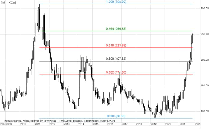 Il future sul caffè arabica di marzo è salito ad un nuovo massimo del decennio sopra i 2,50 dollari per libbra, e dopo mezzo decennio di trading laterale, il prezzo è quasi raddoppiato quest’anno dopo che la siccità e il periodo di gelo degli ultimi decenni hanno decimato il raccolto brasiliano, non solo nel 2021 ma potenzialmente anche per almeno altre due stagioni. Sopra i 2,56 dollari per libbra, il prossimo livello importante nel futuro del caffè arabica sarà il massimo del 2011 a 2,90 dollari per libbra, seguito dal massimo di 24 anni a 3,09 dollari per libbra.