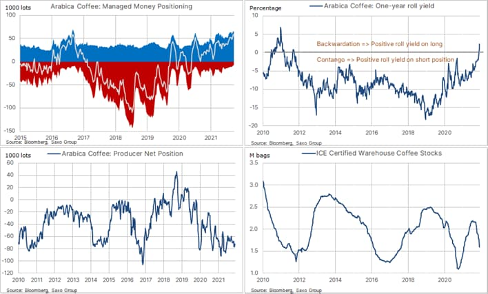 era in media intorno al dieci per cento. Questo cosiddetto negative carry si verifica quando il mercato è in eccesso di offerta, quindi in una struttura chiamata contango. Per un certo numero di anni il caffè ha avuto il contango più alto e come tale è stato uno degli scambi allo scoperto preferiti dagli investitori finanziari tra tutte le materie prime. Il cambiamento delle condizioni di mercato di quest’anno ha visto il rendimento tornare in positivo o in backwardation, quindi – per la prima volta dal 2011- un investitore viene ora premiato con un carry positivo per detenere una posizione lunga nel mercato dei futures.
