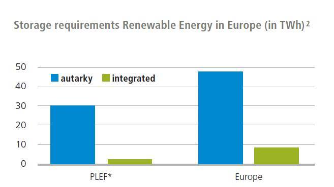 Le tecnologie del fotovoltaico solare, dell’eolico e dell’idroelettrico, che sono correlate negativamente, come pure le differenze regionali tra la forza del vento sulle coste settentrionali e l’elevato irraggiamento solare a Sud, si completano a vicenda. Rispetto all’obiettivo di autosufficienza, l’interconnessione dei Paesi membri consentirebbe di ridurre di dieci volte i requisiti di stoccaggio per l’elettricità rinnovabile e la capacità aggiuntiva delle centrali elettriche fossili.