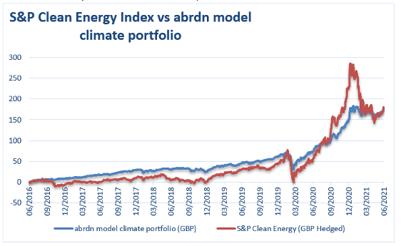 Fonte: adrdn, Bloomberg, MSCI, S&P. Agosto 2021. I risultati passati non sono indicativi dei risultati futuri, e non sono garantiti. Queste cifre fanno riferimento a una simulazione delle performance passate. Tale simulazione è stata svolta mediante un portafoglio modello composto da titoli azionari, obbligazionari e infrastrutturali con un elevato allineamento alla Tassonomia UE. Nell’interpretarne i risultati, gli investitori dovrebbero tenere sempre in considerazione i limiti del modello applicato.I rendimenti sono presentati al lordo di commissioni e altri oneri, la cui applicazione ridurrebbe l’entità della performance indicata. Le cifre mostrate sono in GBP. Fonte: ASI, Bloomberg, MSCI, S&P. Agosto 2021.