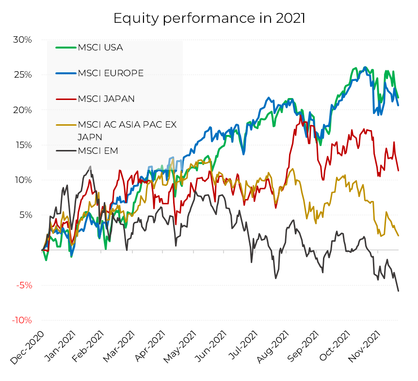 I fondamentali azionari sono stati la più grande sorpresa dell’anno. Il recupero dei margini e l’aumento delle vendite sono stati rapidi e, nonostante le valutazioni stabili, gli indici azionari nel complesso si sono apprezzati. La seconda metà dell’anno ha visto un po’ più di volatilità rispetto alla prima, per colpa soprattutto della variante Omicron, che è causa di incertezza, ma i principali mercati come Stati Uniti, Europa e Giappone hanno fatto registrare una forte crescita.