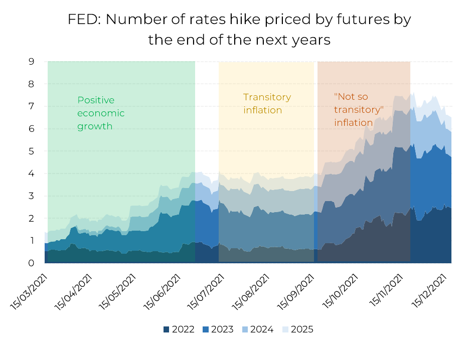 Rimanendo per un momento sul tema dell’inflazione, il grafico successivo mostra il sentimento intorno a potenziali aumenti dei tassi. Dalla crescita economica positiva, all’inflazione transitoria, all’inflazione non transitoria, si nota come la narrativa dominante nelle diverse fasi del 2021 abbia influito sulle aspettative di rialzo dei tassi.