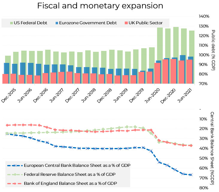 I governi hanno continuato ad adottare misure di stimolo drastiche e radicali, dopo le azioni senza precedenti intraprese nel 2020. Per ora, sono le Banche Centrali ad aver pagato il conto. Come si vede, l’espansione dei bilanci della Banca Centrale è andata di pari passo con l’aumento del debito pubblico. Questo, ovviamente, crea uno squilibrio, ora che i banchieri centrali si trovano a dover invertire la politica monetaria.