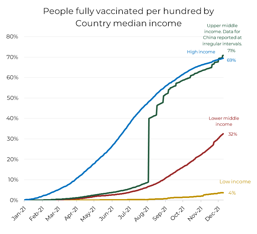 La situazione resta ancora più incerta per i Paesi in via di sviluppo. La diffusione dei vaccini è stata molto diseguale. L’Europa e il Nord America sono stati rapidi nel vaccinare porzioni significative della loro popolazione, avendo acquistato milioni di dosi sin da subito. Il grafico seguente mostra il divario tra i tassi di vaccinazione nei Paesi in base al loro reddito mediano. Un PIL più elevato, in generale, corrisponde a tassi di vaccinazione più elevati: il 2022 dovrà essere l’anno in cui la campagna vaccinale dovrà fare il salto di qualità anche per ridurre il rischio di nuove variabili.