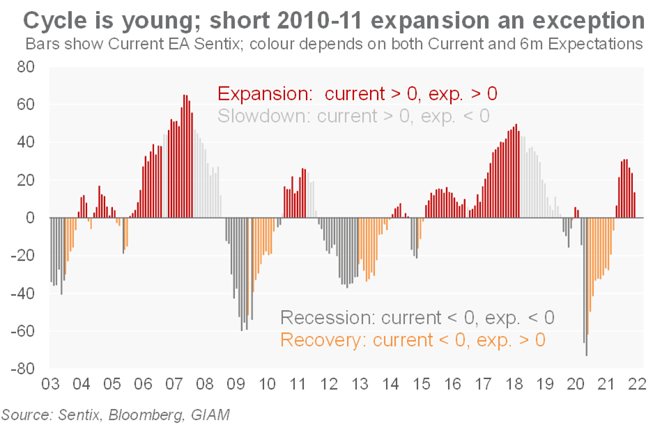 Il nuovo anno cinese inizierà il 1° febbraio, e sarà l’Anno della Tigre: vigorosa, coraggiosa, ma emotiva e sensibile. I mercati azionari hanno ruggito durante le festività prima di fare un passo indietro la scorsa settimana, quando la Fed ha mostrato i suoi denti. Questo potrebbe riassumere bene i conflitti che dobbiamo attenderci nel 2022. Il ciclo attuale è ancora giovane e, mentre il Covid diventerà endemico, una solida spesa per investimenti capex e il ciclo di consumo sosterranno la ripresa in corso. Ma l’inflazione persistente sosterrà una normalizzazione della politica monetaria e le oscillazioni della Fed (inflazione vs. crescita) creeranno volatilità. In tre settimane il tasso OIS USD 5y3m è passato dall’1,35% all’1,75%, un valore più realistico ma ancora basso, considerando che l’inflazione breakeven 5y5y è al 2,50%. I problemi di sostenibilità del debito e stabilità finanziaria dovrebbero contenere i rendimenti a lungo termine, ma il probabile Quantitative Tightening della Fed rende prudente la nostra previsione del 2% a 10 anni.