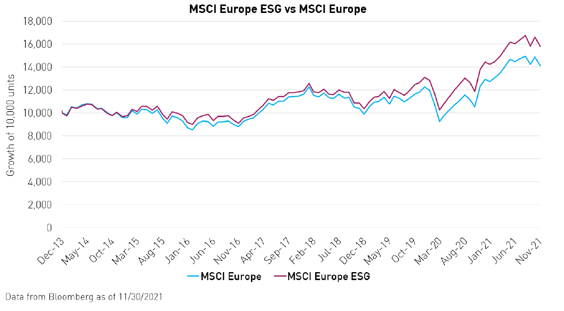 Abbiamo esaminato la performance degli indici MSCI Standard e MSCI ESG Leaders per gli USA, l’Europa e la Cina. Per quanto riguarda il mercato statunitense, meno regolamentato, abbiamo scoperto che negli ultimi 8 anni l’ESG non ha avuto un impatto significativo sulla performance e ha registrato una sovraperformance cumulativa dell’8,8%. In Europa si è verificato il contrario: l’ESG ha fornito una spinta consistente alla performance per tutto il periodo, con una sovraperformance totale del 17%. È in Cina, tuttavia, che l’effetto è stato più marcato, con l’ESG che ha sovraperformato in ogni periodo e ha fornito una sovraperformance cumulativa pari al 102,1%.
