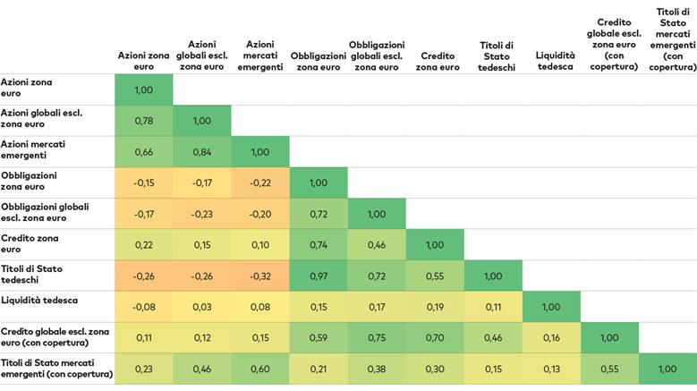 In particolare, le obbligazioni della zona euro, le obbligazioni globali escl. zona euro e i titoli di Stato tedeschi dovrebbero mantenere una correlazione negativa con le azioni della zona euro, le azioni globali ex-zona euro e le azioni dei mercati emergenti. Il credito della zona euro, quello globale e quello dei mercati emergenti, invece, dovrebbero essere correlati positivamente con i mercati azionari.
