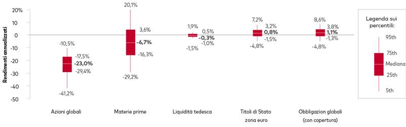Le proiezioni devono essere considerate ipotetiche e non rispecchiano né garantiscono risultati futuri. Note: Ogni barra indica la distribuzione dei rendimenti nominali mediani di varie classi di attivi nel decile peggiore dei rendimenti azionari globali. Previsioni VCMM al 30 settembre 2021 in EUR per le classi di attivi qui evidenziate. Si rimanda alla sezione dell’Appendice intitolata “Indici per le simulazioni VCMM” per ulteriori dettagli sulle classi di attività finanziarie. Fonte: Calcoli di Vanguard al 30 settembre 2021.