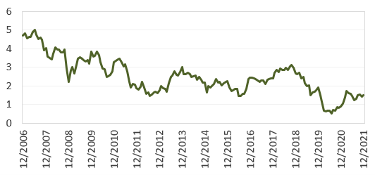 Negli ultimi due anni, tale range medio è stato pari a 1%-1,8%, un livello inferiore di circa 100 bps rispetto al periodo precedente, come evidenziato dal seguente grafico: