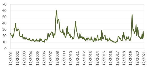 E la volatilità che ci aspettiamo caratterizzerà il 2022 ha già evidenziato un cambio di regime: siamo infatti passati da un indice di volatilità (“VIX”) medio nel decennio 2009 – 2019 di circa il 15% (fatto salvo il picco della crisi dei debiti sovrani del 2011) a una media, nell’ultimo biennio, del 25%: