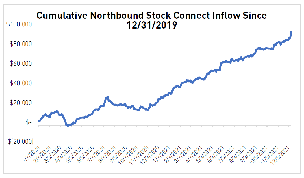 Nel novembre del 2021, la China Securities Regulatory Commission (CSRC) ha dato il via libera alla quotazione dei futures sulle A-Shares alla borsa di Hong Kong, un passo avanti significativo che aumenta le probabilità che nel 2022 ci sia una maggiore inclusione delle A-shares negli indici globali. Una delle principali preoccupazioni per MSCI per procedere in tal senso, infatti, era l’esistenza di un derivato sulle A-shares, che permettesse agli investitori internazionali di gestire i rischi connessi alle azioni domestiche. Inoltre, nel 2021 la pressione sulle azioni cinesi offshore ha favorito le azioni quotate nella Cina continentale e le ha rese più popolari tra gli investitori stranieri, come indicato dai flussi record sulla piattaforma di stock connect Northbound che permette di accedere ai listini di Shanghai e Shenzen attraverso la borsa di Hong Kong. Tuttavia, nel 2022, il contesto politico teso negli Stati Uniti nell’anno delle elezioni potrebbe agire come fattore contrario a questo trend.