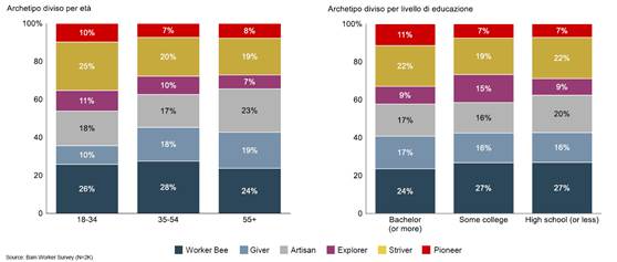 “In Italia”, spiega Roberta Berlinghieri, “l’archetipo più diffuso è il primo, quello dei worker bees, gli operativi. In particolare, questa predominanza si evidenzia nella fascia di età 35-54”.